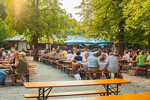 Im Selbstbedienungsbereich mit Biertischen und –bänken holt man sich seine Getränke und sein Essen selbst. Man darf sogar die Brotzeit von zu Hause mitbringen. Getränke werden jedoch vor Ort gekauft. Wer es gemütlich mag, lässt sich im bedienten Bereich an kleineren gedeckten Tischen, Essen und Getränke vom Personal bringen.